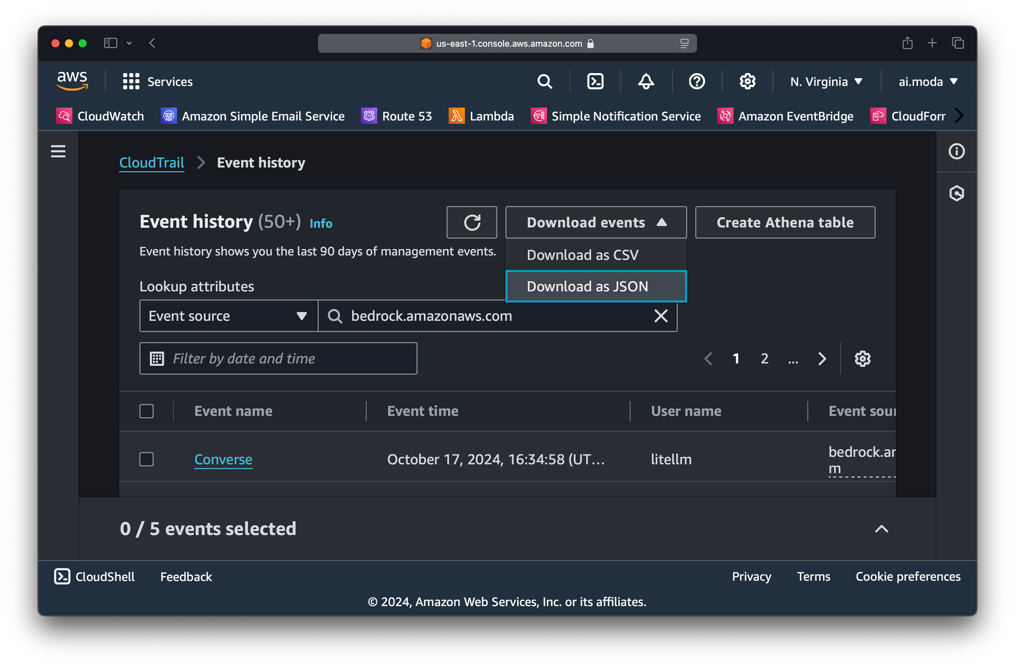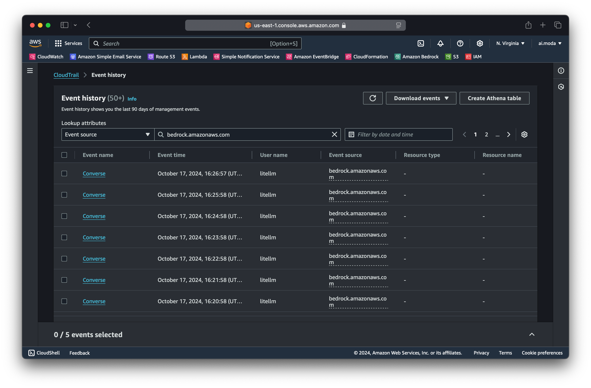 Moving on to CloudTrail, we just need to filter the Event source by bedrock.amazonaws.com to see all the Bedrock calls.
