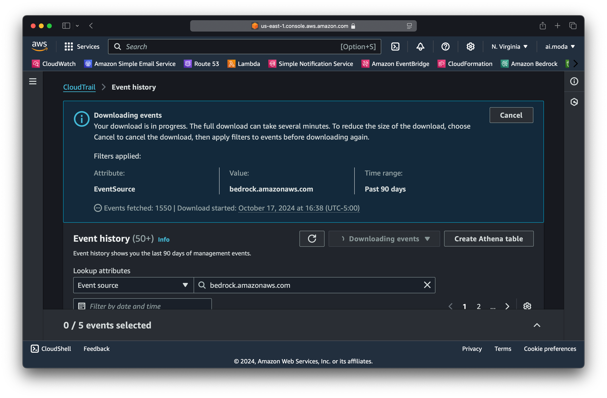 You'll now wait a few minutes for all the Amazon Bedrock CloudTrail events from the past 90 days to be downloaded.