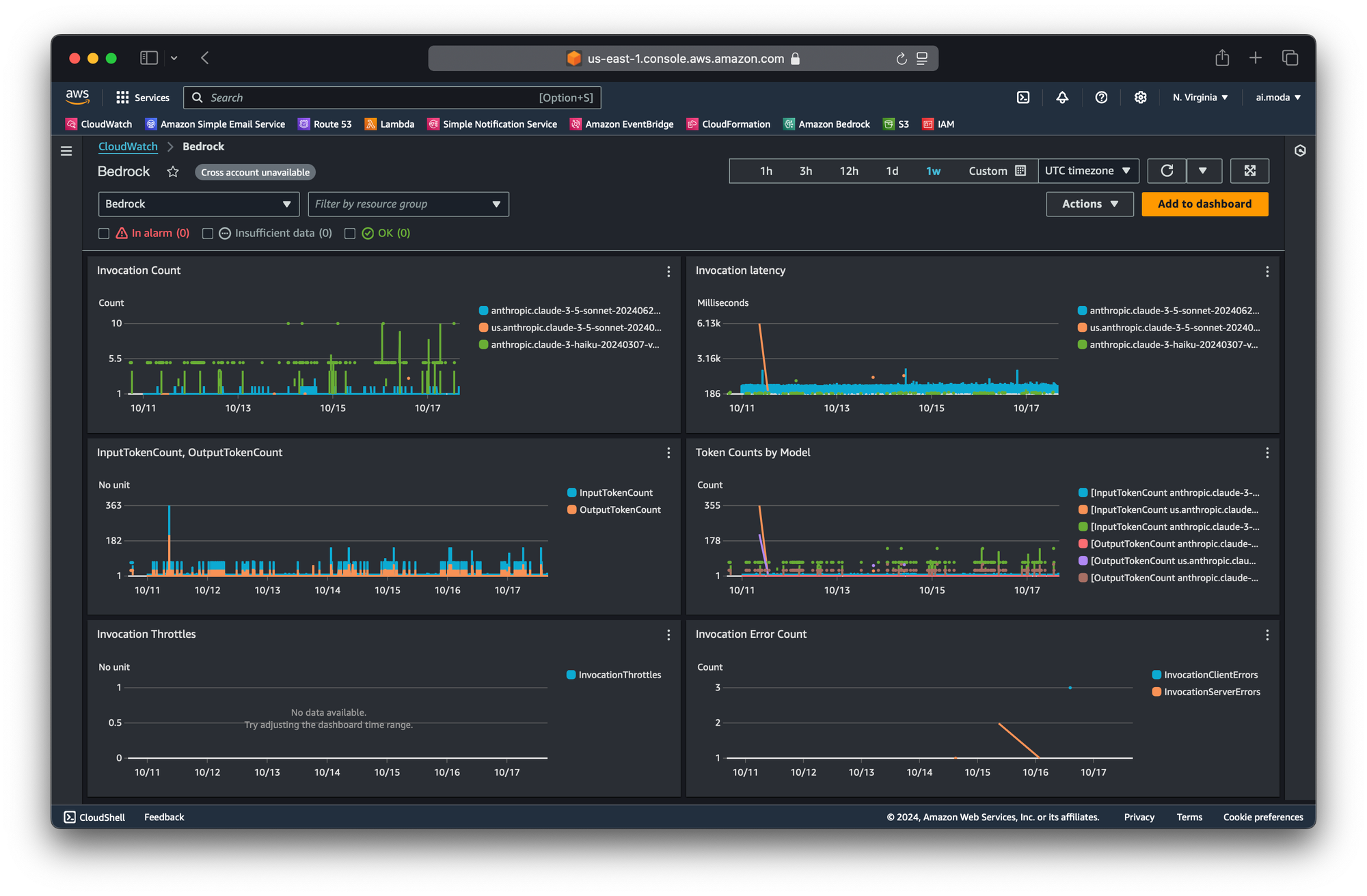 If we look at us.anthropic.claude-3-5-sonnet-20240620-v1:0, the picture isn't as pretty. We see 318 errors on 12,359 requests, for a total error rate of 2.57%. (This was due an outage for the cross-region Claude 3.5 Sonnet profile in us-east-1, which lasted several hours on October 3-4, 2024.) This should highlight the need for adding failovers in your code, even if you're using cross-region profiles (which can, and have, failed).