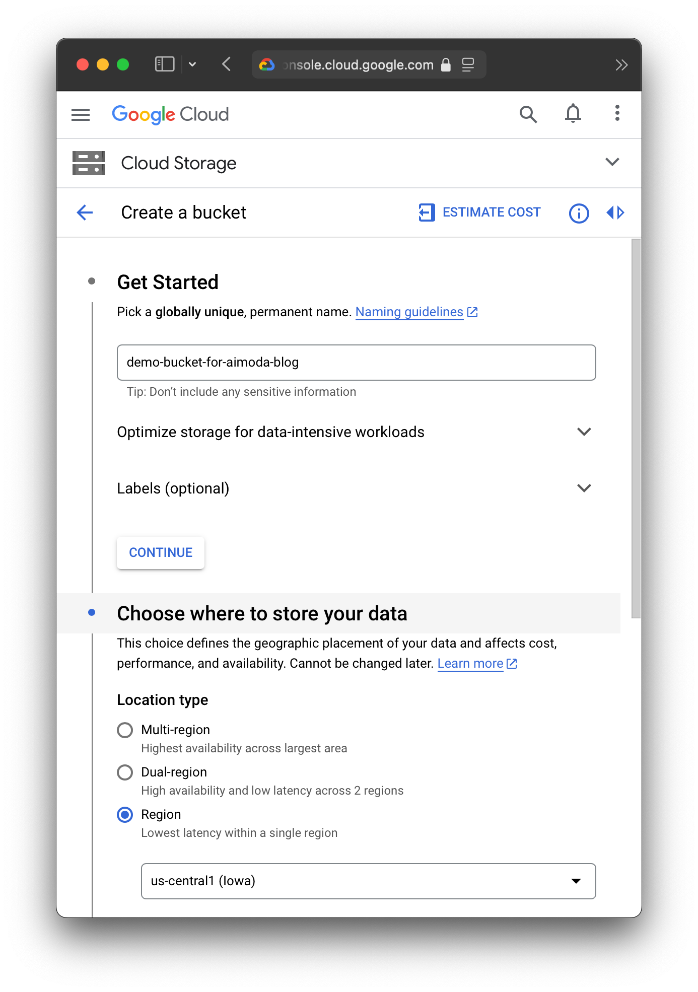 First, create a bucket where there's a supported regional endpoint. We'll use us-central1 for our example.