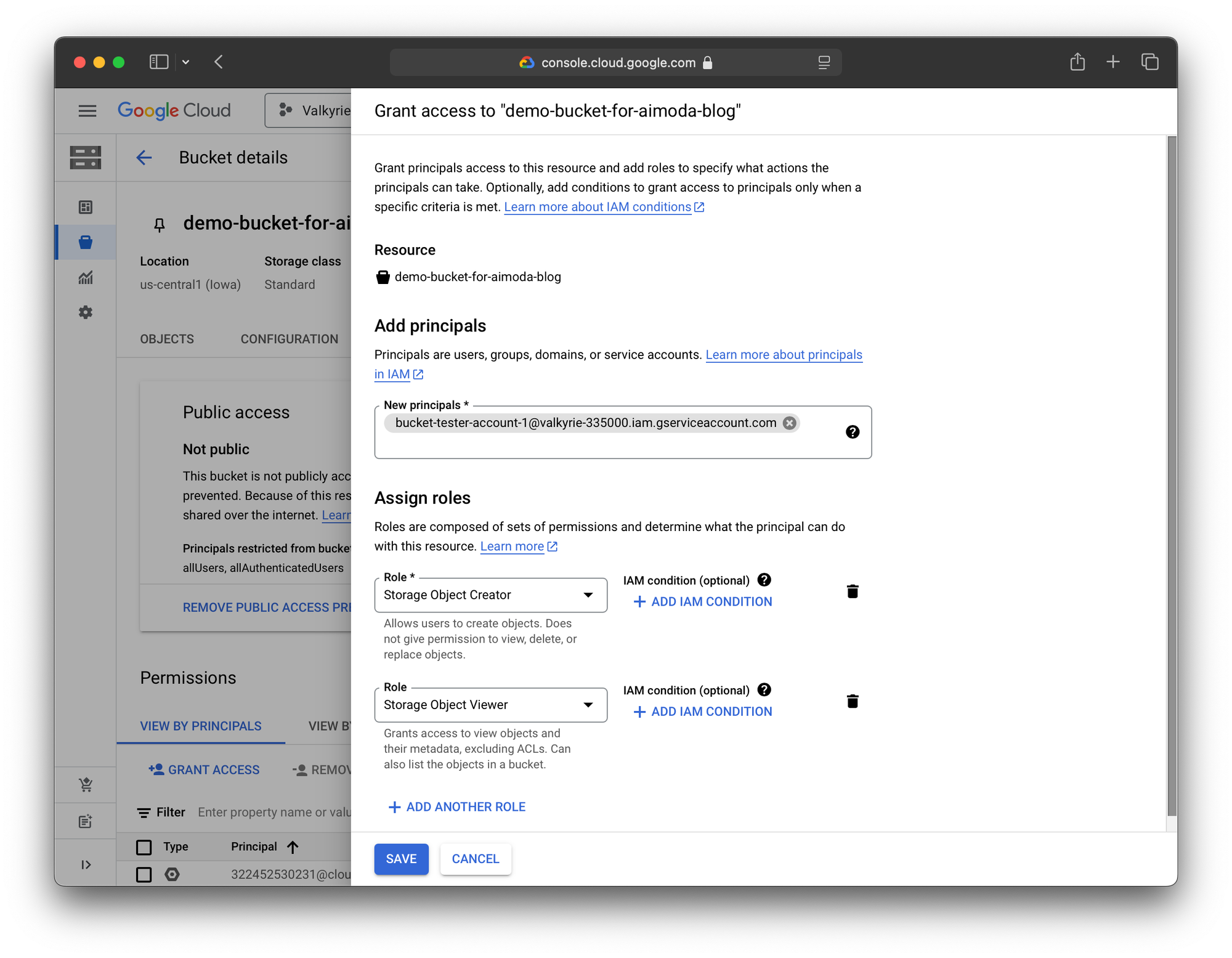 Next, give a service account the appropriate permissions. In our case, we'll give it access to read and write files. (If we were using this service account to only share existing files, then only Storage Object Viewer would be the correct and more secure setup.)